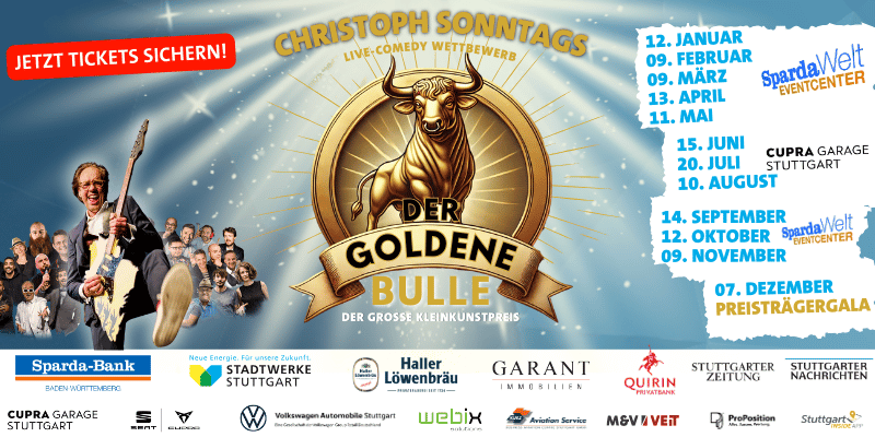 Die Kleinkunstszene feiert eine neue Sensation: Nach großem Erfolg in Ulm kommt der renommierte Kleinkunstpreis „Der Goldene Bulle“ endlich in die Landeshauptstadt! Seien Sie dabei, wenn großartige Künstler*innen ihr Talent auf die Bühne bringen!Bei jeder Veranstaltung treten zwei Kleinkünstler*innen im direkten Duell gegeneinander an und kämpfen um den begehrten Einzug ins große Finale. Und das Beste: Sie als Publikum entscheiden mit! Vergeben Sie Punkte in verschiedenen Kategorien und bestimmen Sie, wer es ins Finale im Dezember schafft. Dort werden die Gewinner des Goldenen, Silbernen und Bronzenen Bullen gekürt – inklusive hochdotiertem Preisgeld!